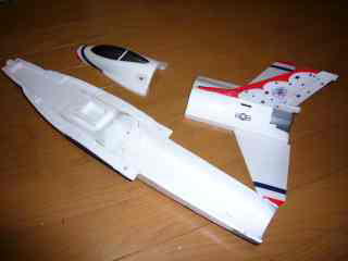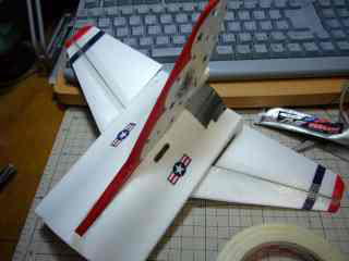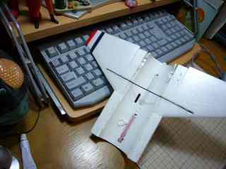 写真ではわかりにくいですが、水平尾翼の後縁は1mmカーボンロッドで補強した後に、グラステープをヒンジにしています。
