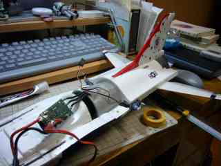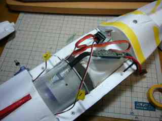 主翼をビス固定。アンプと受信機は左写真の位置に両面テープで固定しました。