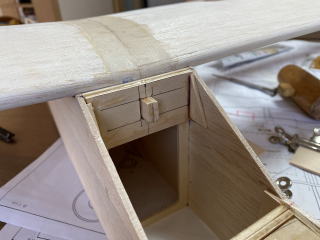 主翼中央の3mmバルサを写真のようにカットして、3mmべニアから切り出したかぎ状のパーツを合わせます。