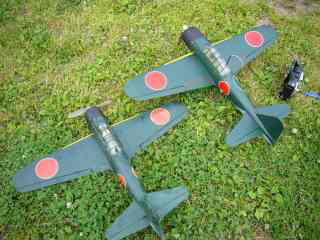 9ヶ月もの長期にわたり主力戦闘機として活躍しつづけている2代目GWSゼロであるが、あれほど下地処理に苦労した表面が傷んできた。右上のフィルム張りのバルサ製ゼロと比較すると肌荒れが目立ちます。