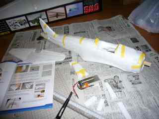 お決まりの胴体接着・・・今回は写真の1200mAhリポを使うので、接着前にバッテリースペースを広げておきました。