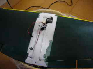 次に生まれてはじめて製作する引き込み脚。適当な大きさに主翼を削って、これまたかなり適当にサーボをマウント。