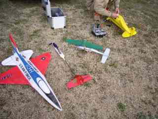 セスナ調整中の台長さん。この日もバルサ機を中心になんと10機持参。