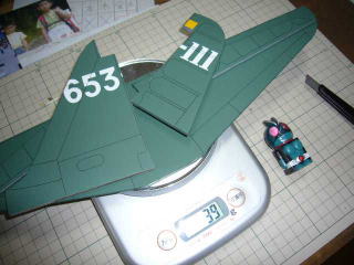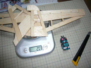 ケツ重を解消するのには頭を重くするか、後ろを軽くするかです。キットに入っていた尾翼は39g、バルサにしてはちょっと重たいような気がします。これを軽量化できればいいのです。