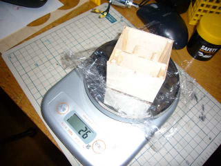 左はオリジナルのモーターマウント。14gと軽量ですが、この大きさでは中にバッテリーを押し込むスペースがありません。そこで2mmベニアで大き目の箱を製作してマウントにします。26gと重くなりますが、錘を積むことを考えれば問題なし。エポキシを多用してがっちり作ります。