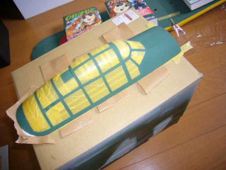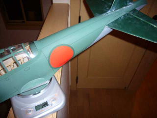 初号機の重心をマスキングテープに写して貼ってみましたが、錘なしでほぼ問題なし。こうなると、もう早く飛ばしたくて仕方がありません。でも、日の丸はないとダメです。