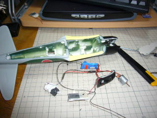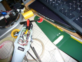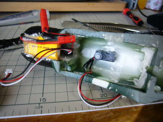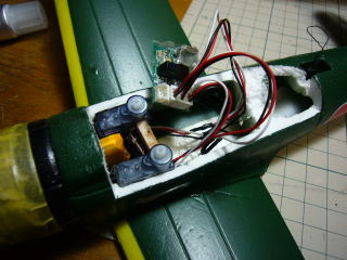 サーボの空気抵抗は思いのほか大きいようなので、やはり内装化に着手。がんばってみましたが重心の関係とかを考えるとこれが精一杯でした。