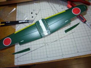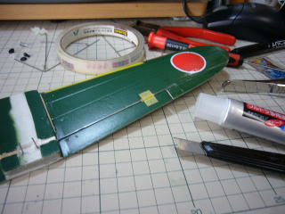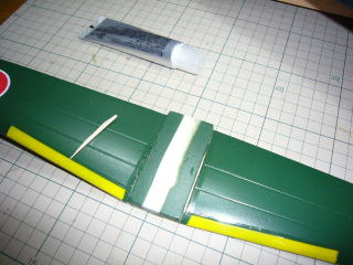 主翼上面に切れ目を入れて1mmバルサを差し込んでSUで接着。いつもの方法です。